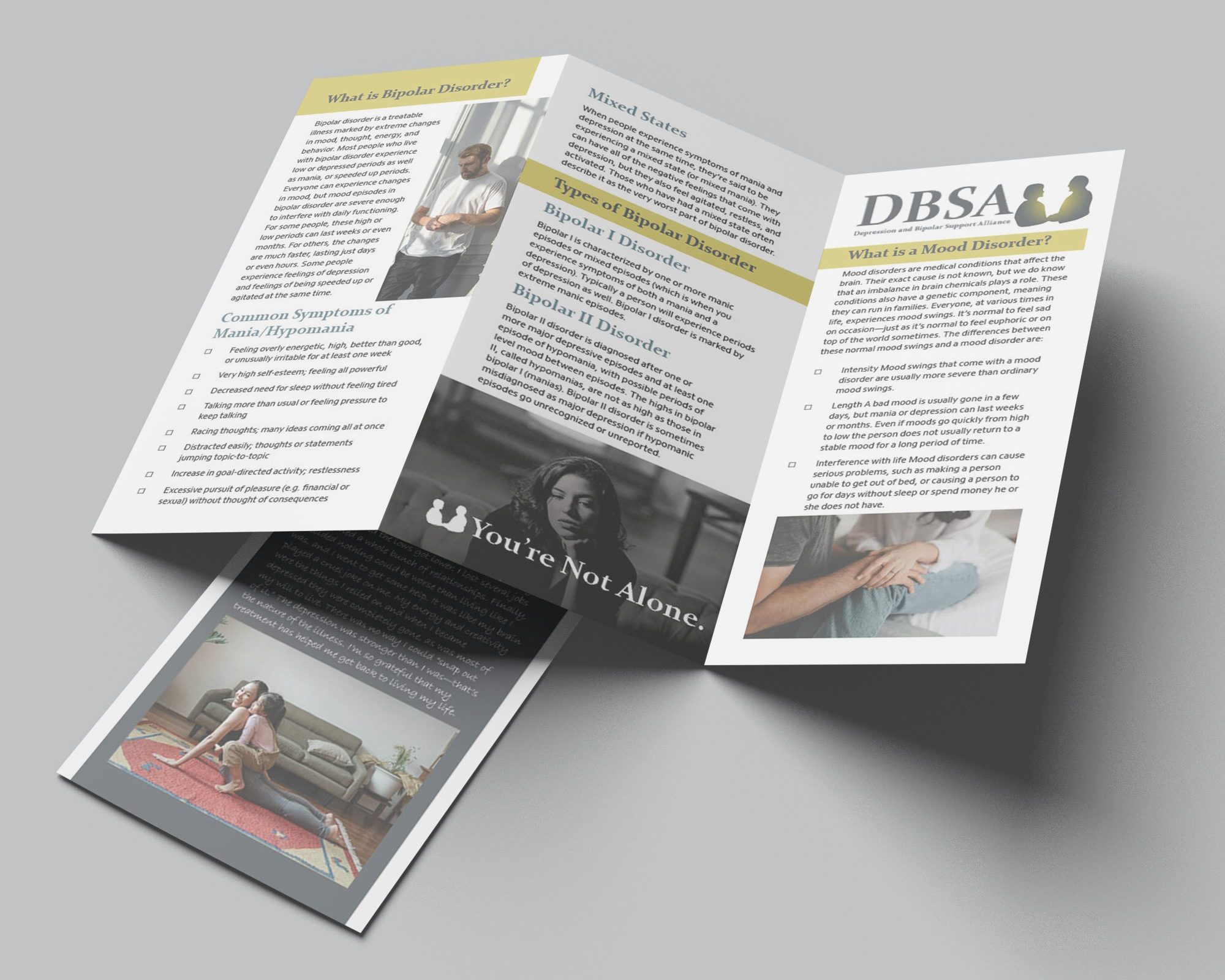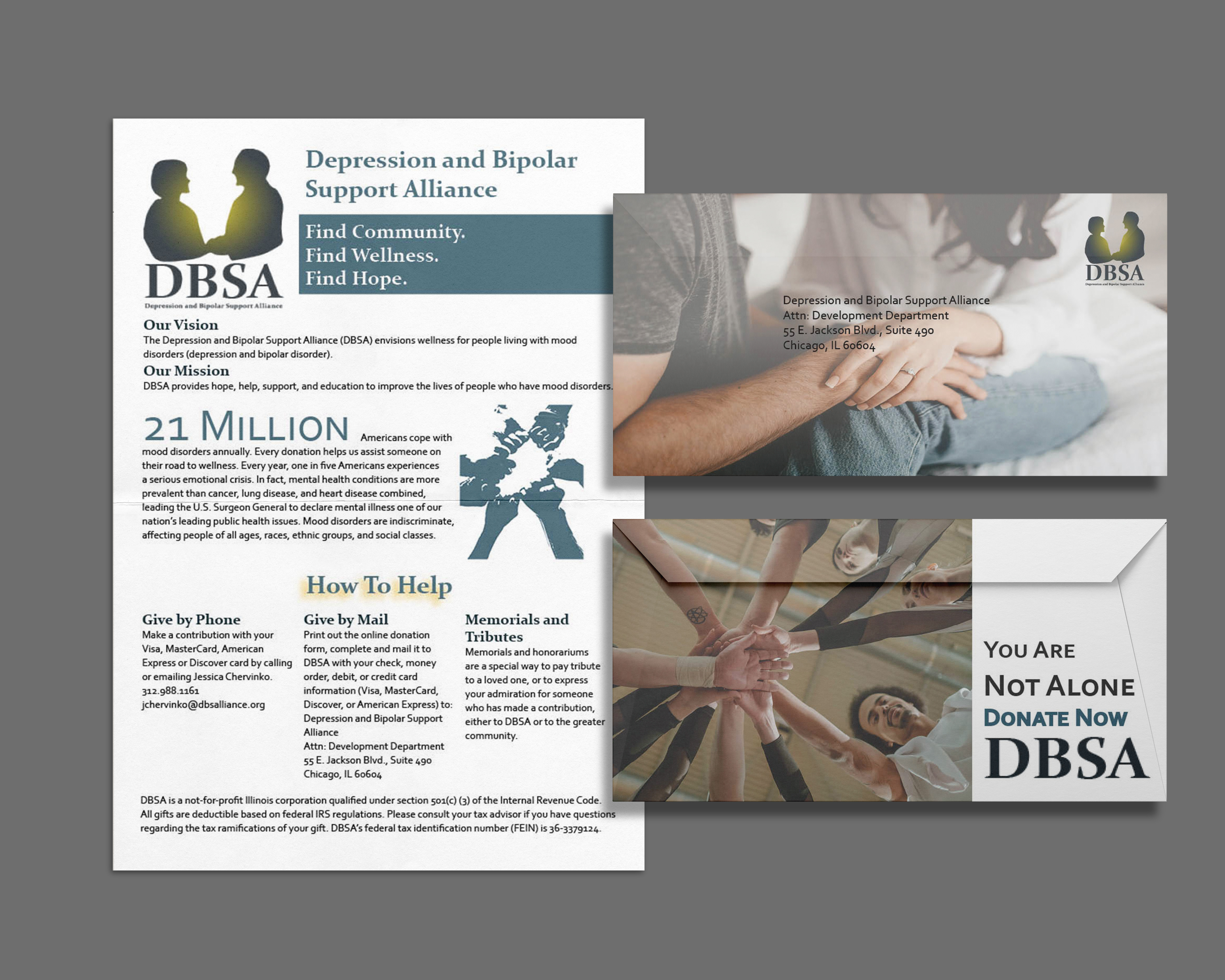 The Depression and Bipolar Support Alliance (DBSA) is a non-profit that offers peer-led support groups and works to destigmatize mental illness. This non-profit’s unique trait is its peer lead sessions, whereas its competitors hold sessions led by psychiatrists. Keeping this in mind, I created a logo that highlights the connection between members. I also created a mailing list to gather donations allowing the organization to operate and redesigned an educational pamphlet to educate and destigmatize mental illness.